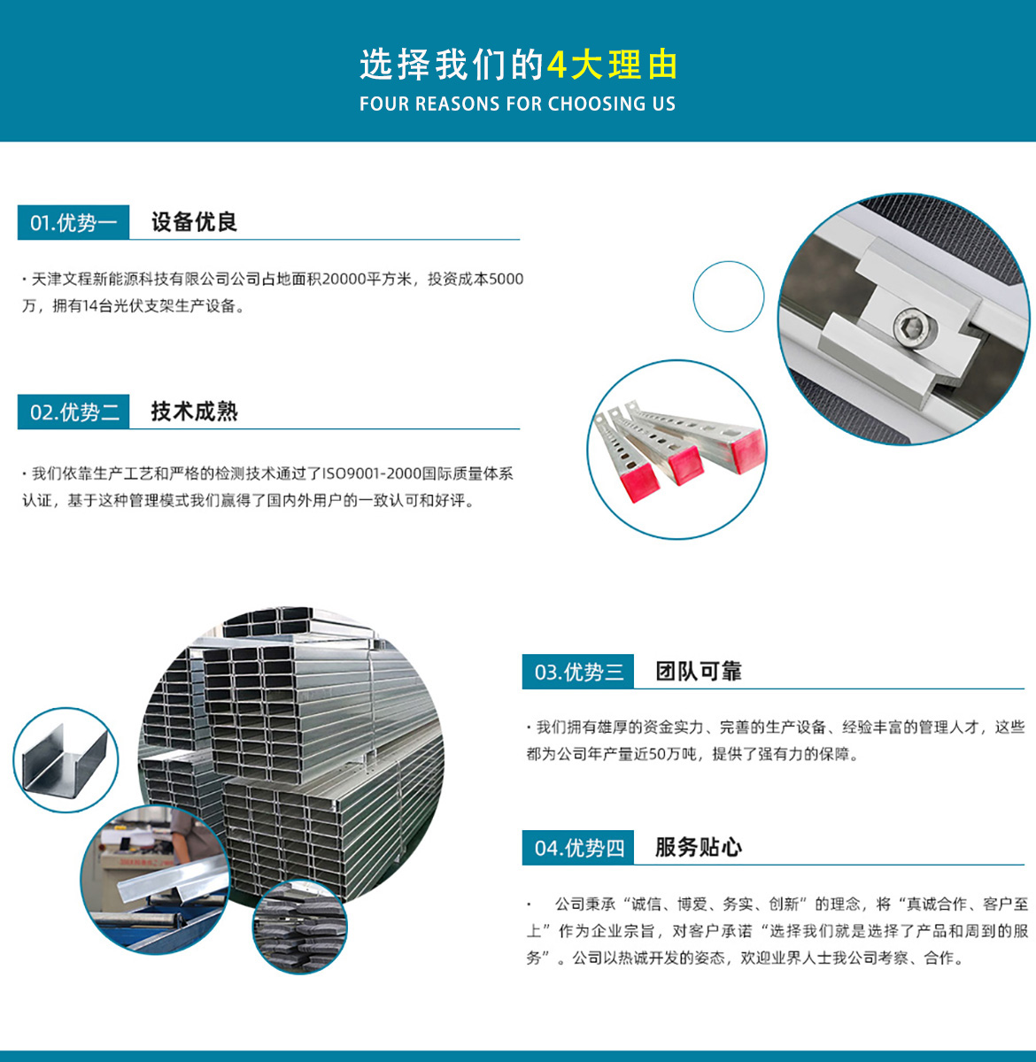 天津文程新能源科技有限公司成立于2021年,是專注于集中式、分布式、漁光互補和農光互補等清潔能源發(fā)電的綜合性企業(yè) 公司是集設計、研發(fā)、生產、制造為一體的綜合型企業(yè)。公司占地面積20000平方米,注冊資金5000萬元整。公司坐落于華北鋼鐵重鎮(zhèn)--大邱莊,距天津市區(qū)50公里、鄰104和205國道及京滬高速,交通十分便捷。 本公司擁有三個生產車間,其中兩個冷彎型鋼車間,一個鋅鋁鎂型鋼車間,擁有自動冷彎成型機10條,自動數(shù)控沖孔機10條以及焊接加工等設備。主要生產產品有:太陽能光伏支架、各種規(guī)格的C/Z/U型鋼、抗震支架、管廊支架及整套配件等。
